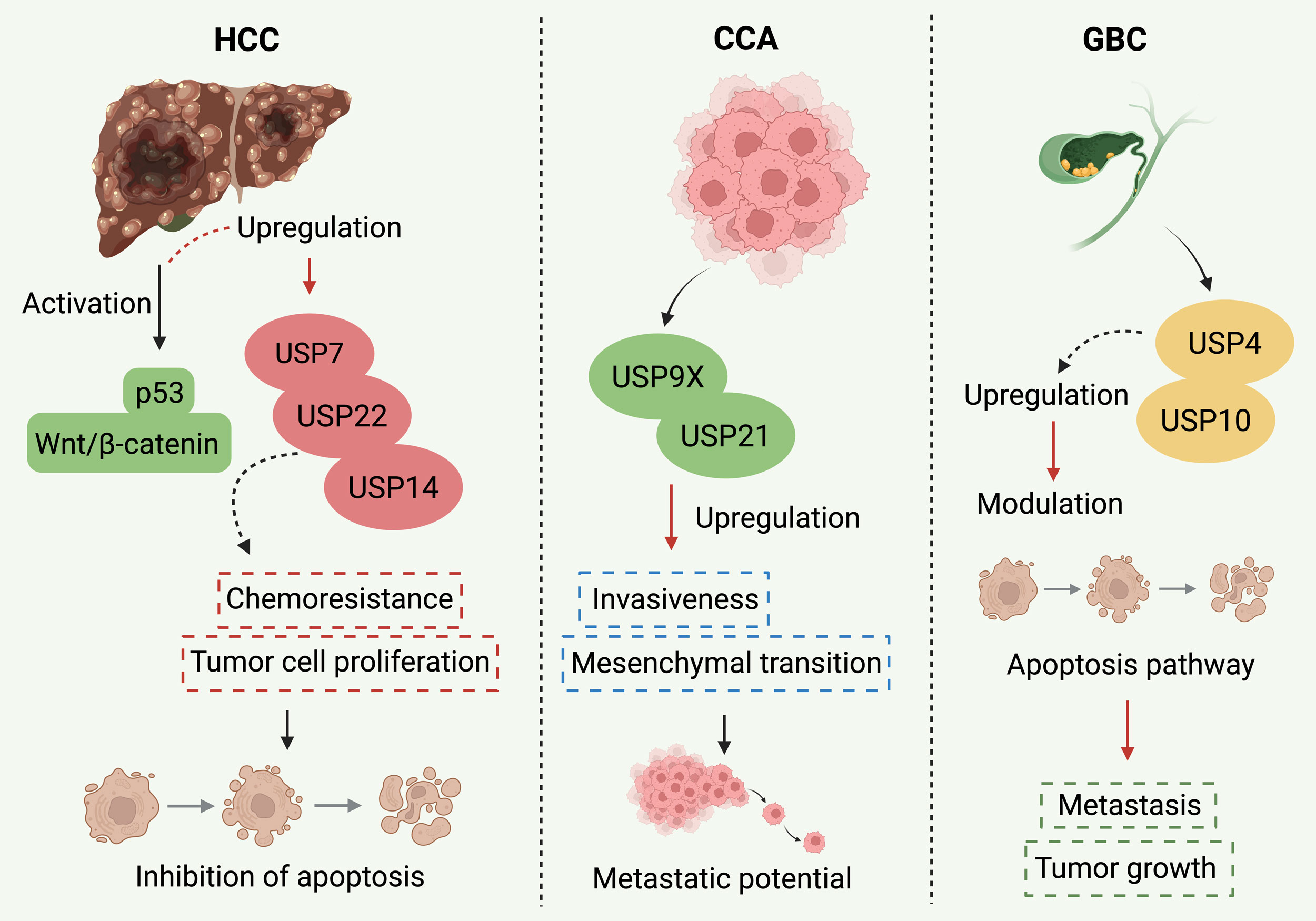 USPs are the regulators of the ubiquitin system protein stability and signalling integrity, which is a finely tuned system of regulation. Tumour initiation, development, and resistance pathways are largely dependent on the coordination of the ubiquitin system; thus, their dysregulation has dire consequences for cancer biology, particularly in the case of hepatobiliary tumours. Understanding the structural, molecular, and environmental factors that shape the USPs activity is a prerequisite to considering them for therapeutic targeting. In the subsequent sections of this review, the specific USPs dysregulation in GBC, CCA, and HCC will be elaborated further with the implications for clinical translation and their mechanistic significance being emphasized [40].
