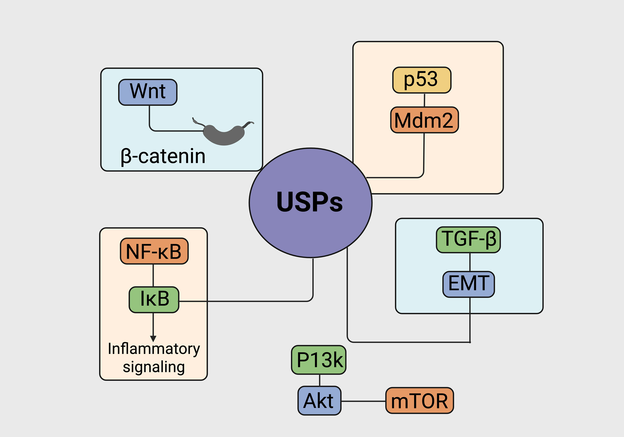 The main mechanism that controls protein stability and turnover, the UPS, is the focus of a quickly developing area of cancer biology. By destroying tumour suppressors or stabilising oncogenic proteins, UPS dysregulation aids in oncogenesis. By eliminating ubiquitin moieties from target proteins, deubiquitinating enzymes (DUBs) balance out ubiquitin ligases in this system [7]. The USP family is the largest and most functionally varied of the more than 100 known DUBs. According to their structural makeup, USPs are cysteine proteases that selectively cleave ubiquitin from protein substrates, influencing the processes that control immunological responses, metabolic signalling, apoptosis, DNA repair, and cell cycle progression [8, 9] (Figure 1).
