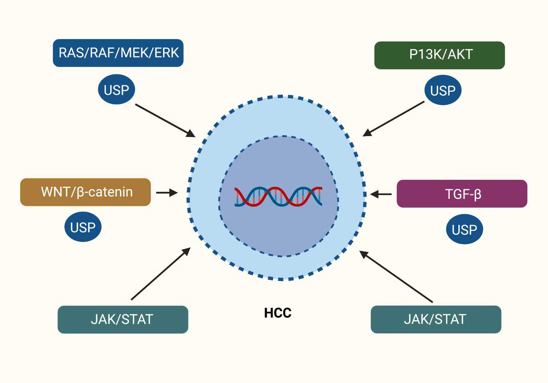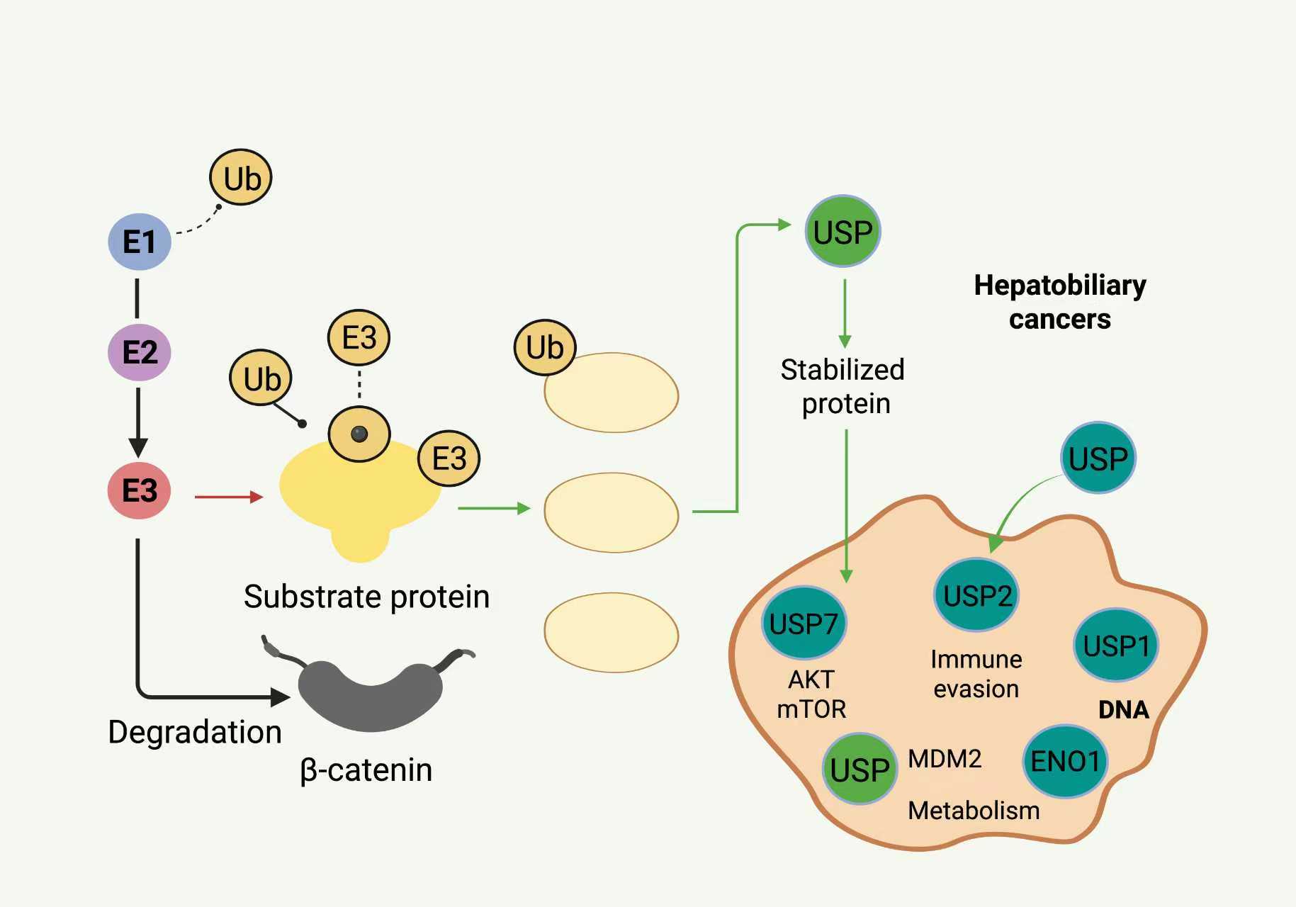 Hepatobiliary malignancies highlight the increasing importance of USPs in the field of cancer biology, which has been the case for the past few years. In HCC, numerous USPs are expressed abnormally and function as molecular drivers of carcinogenesis. For example, it has been shown that USP14, which is significantly elevated in HCC tissues, promotes tumor growth through the HK2/AKT/P62 axis activation, thus linking deubiquitination to the metabolism and survival of cancer cells [10, 11]. Similarly, USP9X promotes the abnormal Wnt signaling by β-catenin's stabilization, connected with poor clinical prognosis [12]. Besides, a few others' USPs like USP7, USP10, and USP22 by regulating oncogenic transcription factors, apoptotic mediators and DNA damage repair proteins, have also been very helpful in the promotion of HCC [13, 14]. Interestingly, some USPs can inhibit tumors in a context-dependent manner, which reflects the complexity of their roles in liver cancer development.