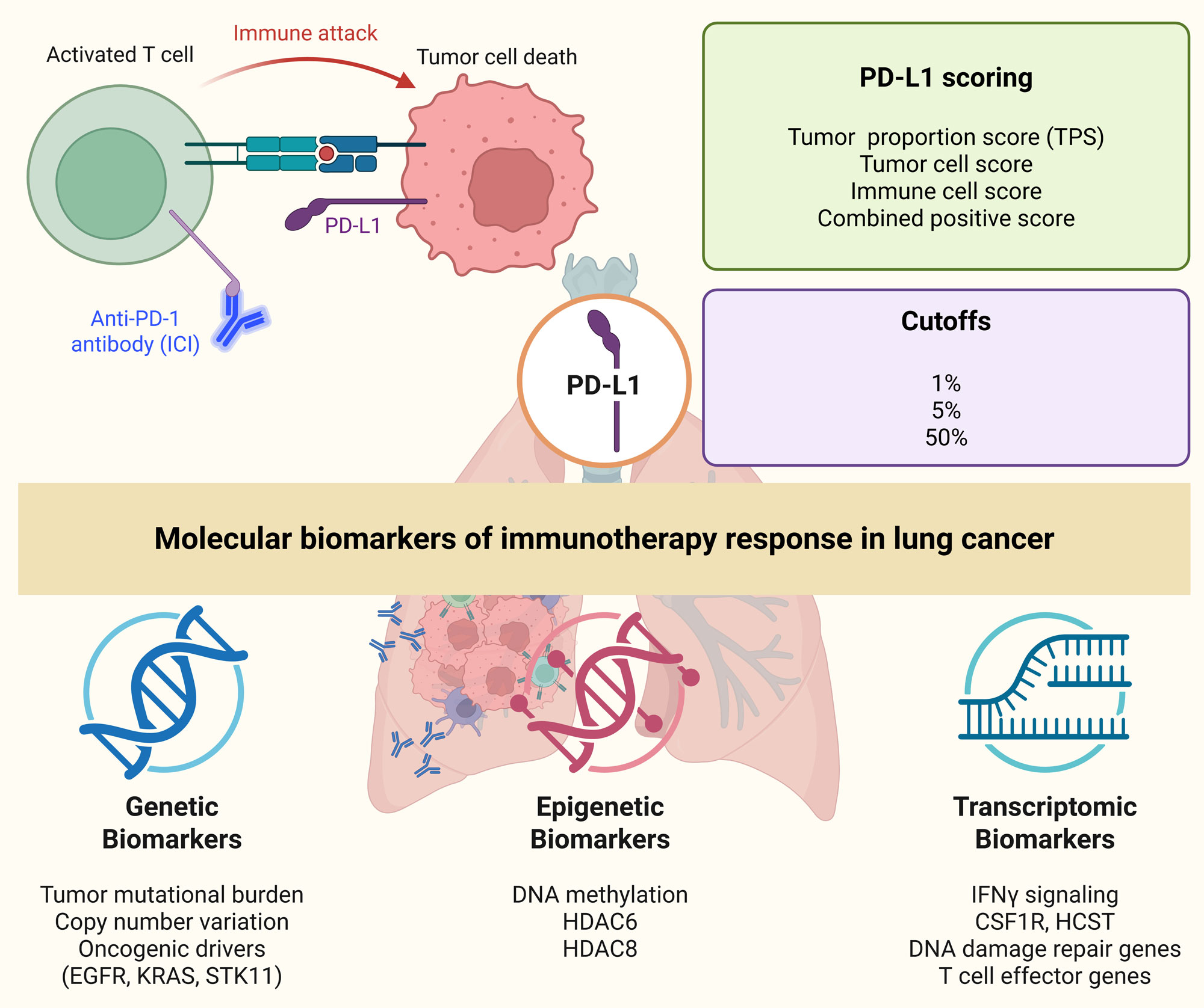 Figure 1. Molecular biomarkers of immunotherapy response in lung cancer. PD-1 blockade with immune checkpoint inhibitors (ICIs) restores T cell activity against tumor cells by disrupting the interaction between PD-1 and PD-L1 on T and tumor cells, respectively. Key molecular biomarkers include PD-L1 expression, assessed through various scoring methods (tumor proportion score, tumor cell score, immune cell score, combined positive score), with higher expression linked to better response. Genetic biomarkers (tumor mutational burden, copy number variations and oncogenic drivers e.g., EGFR, KRAS, STK11 mutations) influence immune recognition. Epigenetic modifications (DNA methylation and histone modifications particularly via histone deacetylases like HDAC6 and HDAC8) present promising tools for predicting immunotherapy response in lung cancer. Transcriptomic markers related to IFNγ signaling, DNA damage repair genes and T cell effector genes, further contribute to immunotherapy outcomes.