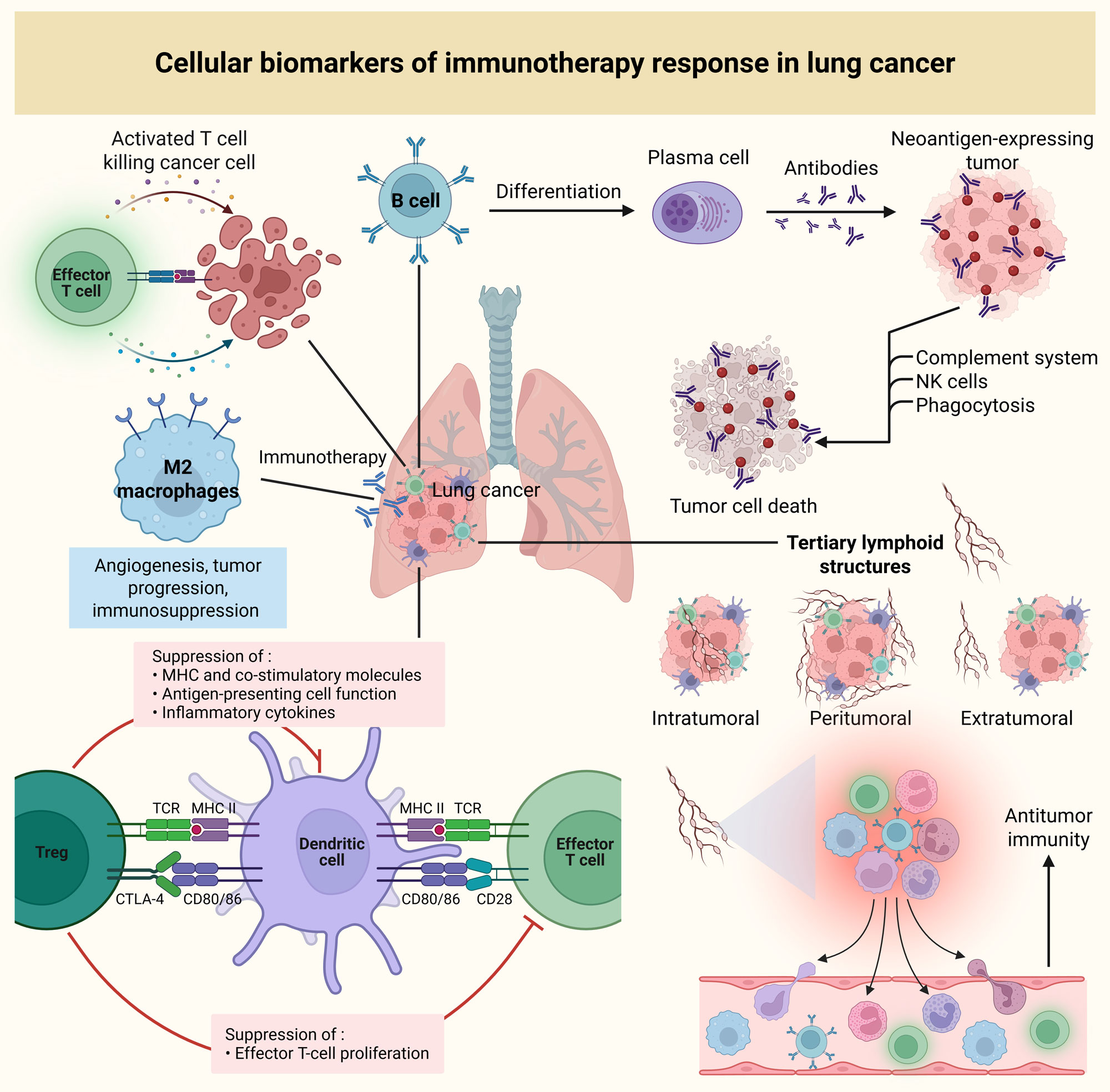 Figure 2. Cellular biomarkers of immunotherapy response in lung cancer. Activated CD8⁺ cytotoxic T cells, which are central to antitumor immunity, are rejuvenated by immune checkpoint inhibitors, driving enhanced tumor cell killing. Tumor-infiltrating B cells, through antibody production and cytokine secretion, contribute to T-cell activation and support antitumor responses. M2 macrophages, associated with immunosuppressive functions, promote tumor progression but may also alter following immunotherapy. Treg cells, which suppress effector T-cell activation, can also limit the efficacy of immunotherapy by downregulating immune responses. Tertiary lymphoid structures, which can develop intratumorally, peritumorally or extratumorally, are key indicators of immune response. The maturity and density of tertiary lymphoid structures, especially intratumoral structures, correlate with improved therapeutic responses and better survival outcomes.