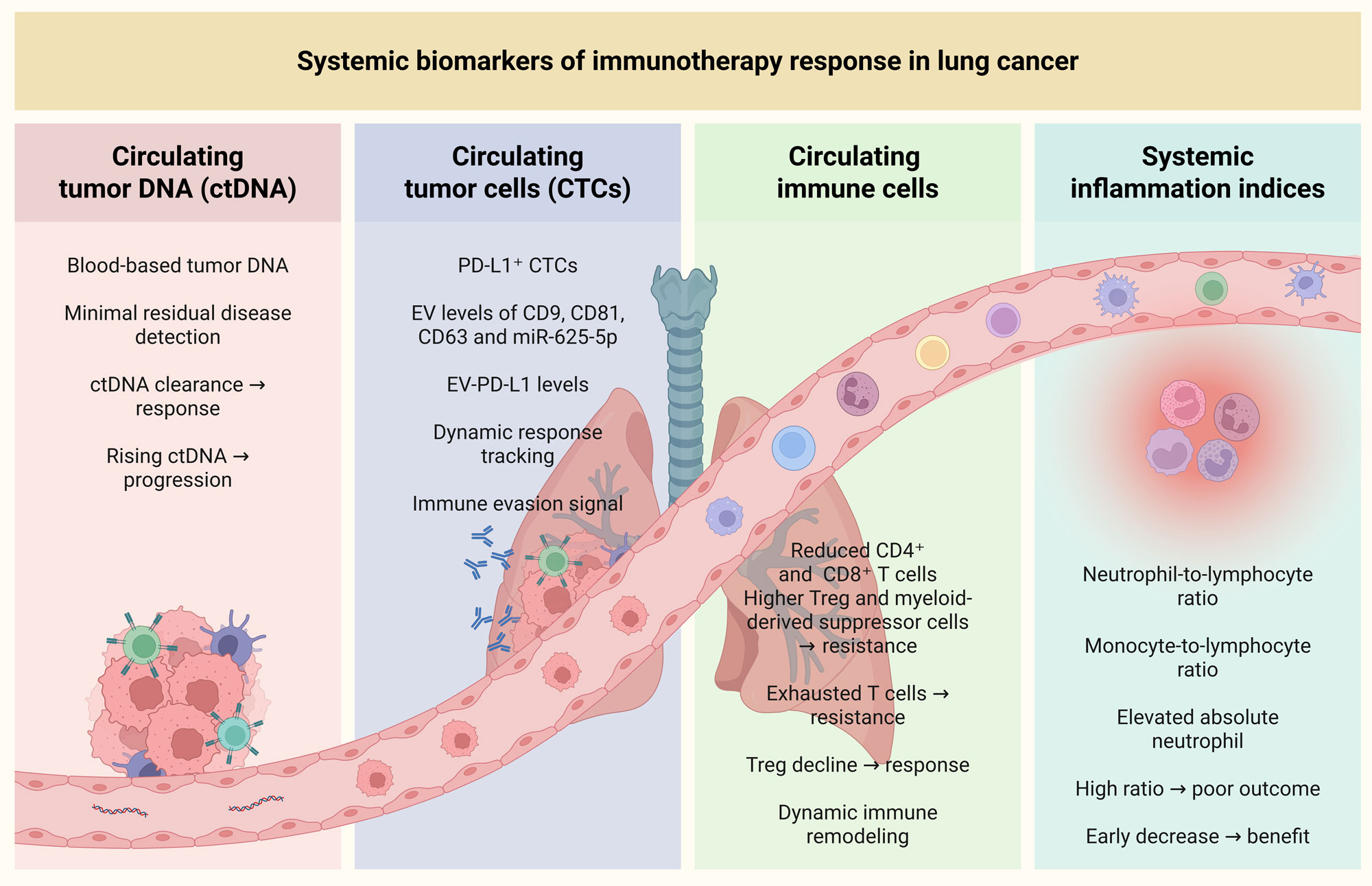 Figure 3. Cellular biomarkers of immunotherapy response in lung cancer. Circulating tumor DNA (ctDNA), circulating tumor cells (CTCs), circulating immune cells, and systemic inflammation indices serve as biomarkers to monitor immune checkpoint inhibitor (ICI) responses in lung cancer. ctDNA, representing blood-based tumor DNA, offers insights into minimal residual disease, with rising ctDNA levels indicating disease progression and ctDNA clearance correlating with therapeutic response. CTCs, particularly PD-L1-positive CTCs, and extracellular vesicles (EV) are linked to immune evasion and can track dynamic responses to immunotherapy, with higher levels associated with poorer outcomes. Circulating immune cell subsets, such as reduced CD4⁺ and CD8⁺ T cells, and increased Tregs, myeloid-derived suppressor cells and exhausted T cells, are indicative of resistance to ICIs. In contrast, a decline in Tregs correlates with better responses. Systemic inflammation indices, including the neutrophil-to-lymphocyte ratio, monocyte-to-lymphocyte ratio and elevated absolute neutrophils provide additional prognostic information, with high ratios linked to poor outcomes and early decreases suggesting therapeutic benefits.
